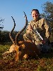 Gene's Day - Lee and I were up at 5:15 a.m. for a 6:10 start. It was Wendy's birthday today and she decided to go out with Harold. Lee decided to join me for the day. Hans, Lee and I left at 6:10 sharp and again picked up Freckie on the way. We had to meet the land owner at the entrance to the property at 6:30 to get the rules for the day like no shooting from the truck, no shooting at waterholes, no shooting if eland were within sight, etc. This was the first year Cruisers has been able to gain exclusive rights to hunting this very promising property and Hans was extra careful not to violate any of the conditions laid down by the owner. Evidently the eland here are being developed as breeding stock and the owner doesn't want to overly disturb them. As well, the owner doesn't want game shying away from vehicles or from waterholes so they can be viewed more easily. His land, his rules, no problem. We started hunting at 6:45 and Hans spotted what he said was a good impala thru the brush and a very heavy fog about 60 yards off the trail. We left the truck and walked back down the trail to where Hans was able to get the shooting tripod set up for my shot. When I got my rifle on the top of the stix and looked thru the scope, all I could really see was an outline of the front of the animal's chest thru the fog. While I was hoping this was the right buck, I centered on what I could see of the chest and touched off my shot. The buck did an instant back flip and ran off to the right about 30 yards where he lay down in the trees. Hans had us wait 15 minutes before we walked up to him so he wouldn't bolt if he wasn't fatally shot. When we finally got to him, there lay a very nice 26" impala. click picture to enlarge Up till now I hadn't seen Hans get very excited but he was quite wound up about the length and spread of these horns. Lee & Freckie now joined us and we did the photo shoot. Hans took quite a few pictures with his own camera. click picture to enlarge We had the impala loaded by 7:45. The fog had lifted by now so Hans and I went for a walk ten minutes after getting the truck back on the trail. click picture to enlarge We walked for about 45 minutes and got into a bunch of waterbuck but no big males. Hans called back to the truck and had Freckie and Lee catch up to us. Jumping aboard, we continued on and saw two honey badgers, a few female nyala and a fair sized kudu bull. At 9:30 we also got a good look a mature nyala bull. Just before 10 a.m. Lee and Han's spotted a ginormus male warthog with huge tusks so off Hans and I went into the bush to stalk this wondrous trophy. After 45 minutes of creeping through the bush, taking agonizingly slow and studied footsteps, Hans finally declared that the warthog must have winded us (me) and taken off. I never did see this warthog. At 11 we decided to head back to camp to drop off the impala and see how everyone else had made out. Brian Clark had shot a very nice red hartebeest quite early so they had been back in camp for a while. When they were on their way in they met up with Harold, Wendy and PH Pieter. Harold had shot a very nice tusker, so Brian's truck loaded the warthog on and they brought it back. Harold and Wendy stayed out until around 11:30. Quentin and Arlene pulled in around noon with a big zebra stallion Quentin had shot. click picture to enlarge Bwana Pieter came in from the skinning shed and congratulated me on my impala. He asked me if I knew the quality of my trophy. I had to say no, so he filled me in. Evidently they had done a rough Safari Club International measurement on the impala's horns. They measured 62 7/8" which will make it a gold medal winner and would rank around the #34 position in the 2005 SCI Record Book for Southern Impala. Now I knew why Hans had gotten a little bit excited. We had lunch at around 12:30. Rod and Johan pulled in just after we started eating. No luck for them on the morning hunt. But by and large, we'd had quite a successful morning with no lost animals. The afternoon hunt was scheduled to start again at 2:30 so a bit of downtime after lunch. While we were waiting for the afternoon hunt, Lee and I thought we'd question Bwana Pieter about the lack of hot water in our shower. Lee tried to shower this morning with no hot water and she told me it was exhilarating to say the least. I was going to wait till tonight for my shower so I never got the blast. Anyways, Bwana Pieter walked into our room, turned the tap and I nearly scalded myself with all the hot water. The trick was, and nobody had bothered to fill us in on this particular shower, that you had to turn the tap and pull it out at the same time to make it work. Looks like good hot showers from here on in. For the afternoon hunt Bwana Pieter sent us off to a concession with very thick and tangled bush as we were going to spend the rest of the day looking for kudu and waterbuck. Lee decided to join us again. We were driving down a trail at about 3:30 when Hans spotted a snake coming out of a hole in a termite mound alongside the trail. Turns out he doesn't like snakes and he wanted me to shoot it. I didn't really want to shoot the thing so I handed him my rifle. He didn't even hesitate, boom and there was no head left. Turns out it was a 5' cobra. Within 5 minutes of the snake episode we came upon a small herd of kudu standing back in the brush. There were two bulls and one had quite a wide spread but Hans said it wasn't a fully mature bull so we continued on. For the rest of the afternoon we alternated walking and driving. We spotted more kudu and several waterbucks but nothing shootable. We hunted until 6 and lost the light so we deadheaded it back home. On the way we heard on the radio that Harold had shot a 51" kudu earlier in the afternoon so we knew we'd have an excited lad on our hands when we arrived home. And there was lots of excitement when we pulled in. Harold had brought in his kudu and it was a beauty. During the afternoon hunt Brian 